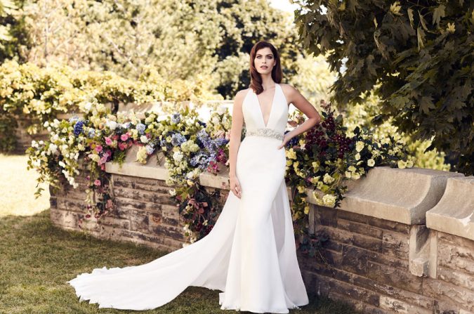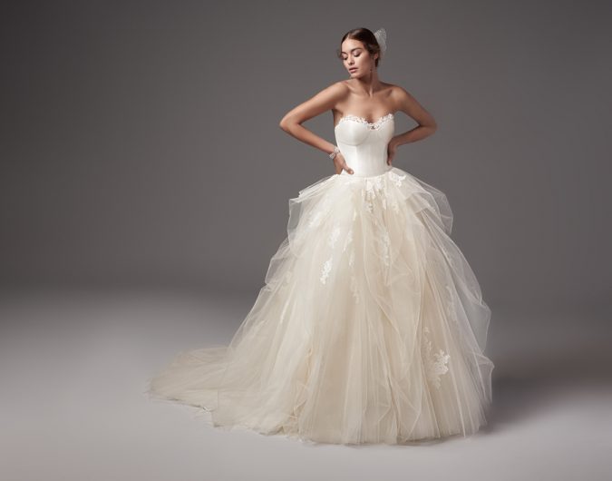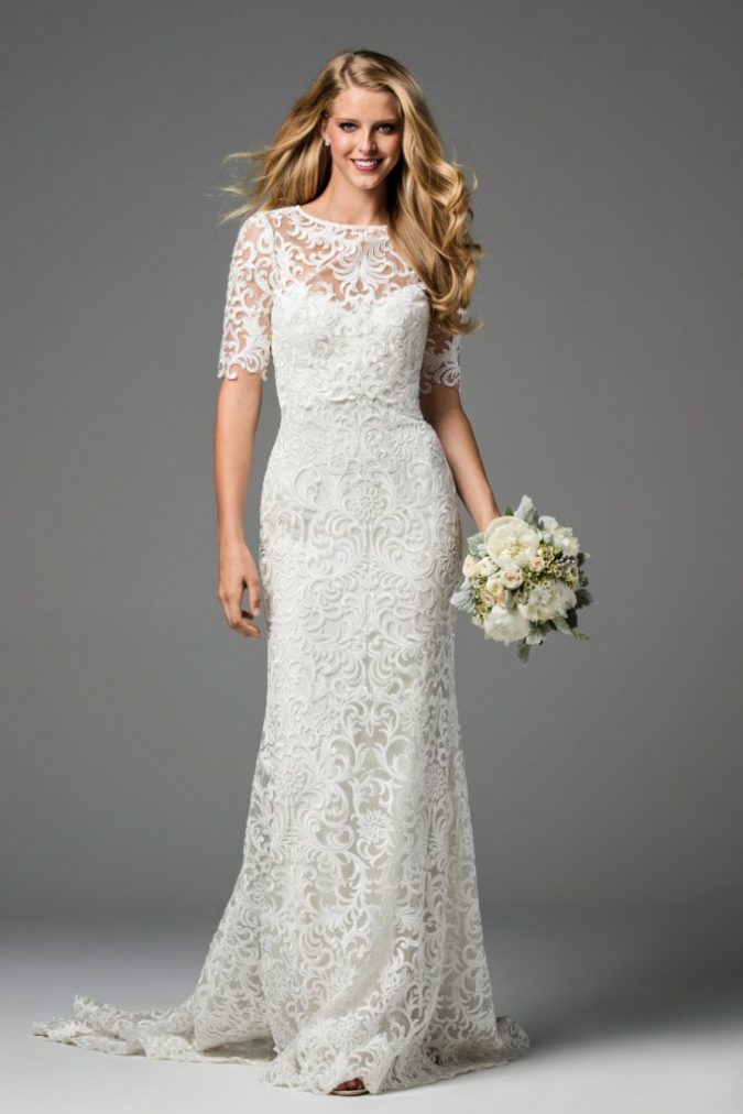 Fit and flare silhouette lace gown with separate co ordinating sleeved overlay by Watters. For local stockist visit: www.watters.com Stunning bridal designs with illusion and lace sleeve detailing, delicate designs and statement styling Nude tulle bodice with long sleeves, lace on bodice and sleeves, belt at waist with full organdy skirt by Paloma Blanca. For…